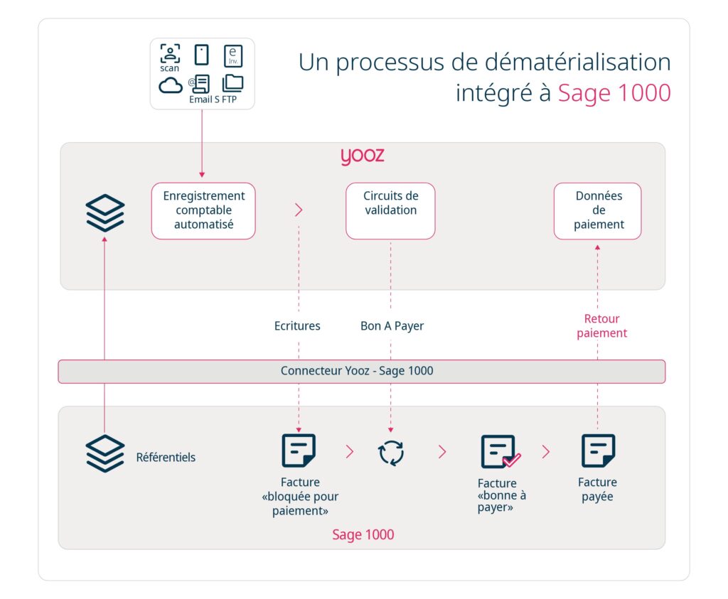 - Connecteur Yooz / Sage 1000 = synchro automatique des référentiels, génération des écritures et bons à payer, suivi du statut en temps réel